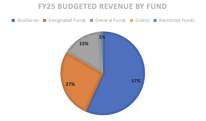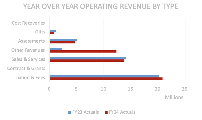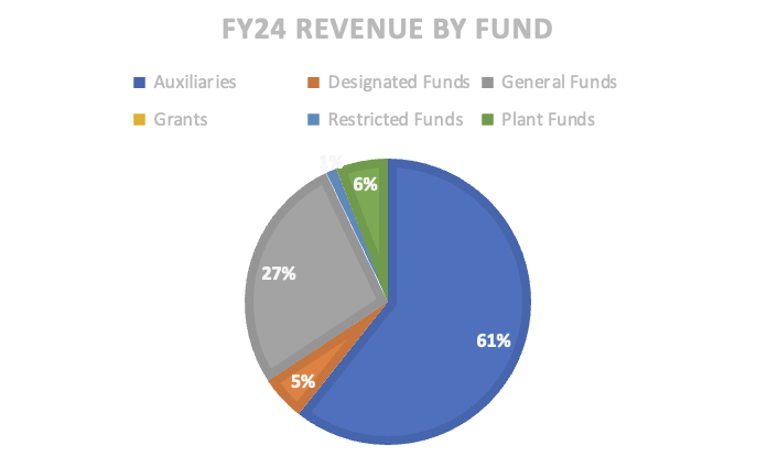 Over 52% of total expenses were tied to compensation for fiscal year 2024. The $25M spent on compensation was an increase of 6% from the prior year, however even after adding almost 100 full-time and nearly 700 part-time staff as part of the reorganization during the year, compensation expenses ended the year 10% lower than what was budgeted. Student Life has been conscientious to review how vacant positions tie to the vision of creating a premier and thriving student experience. The result of the positional review has been that some positions were reclassified and other positions have been eliminated. This mission-centric and values-based approach to staffing generated a savings of over $4M, of which 83% were within Auxiliary units and 16% on the general fund. These savings will be used for student programming, one-time initiatives, and deferred maintenance in the next fiscal year.