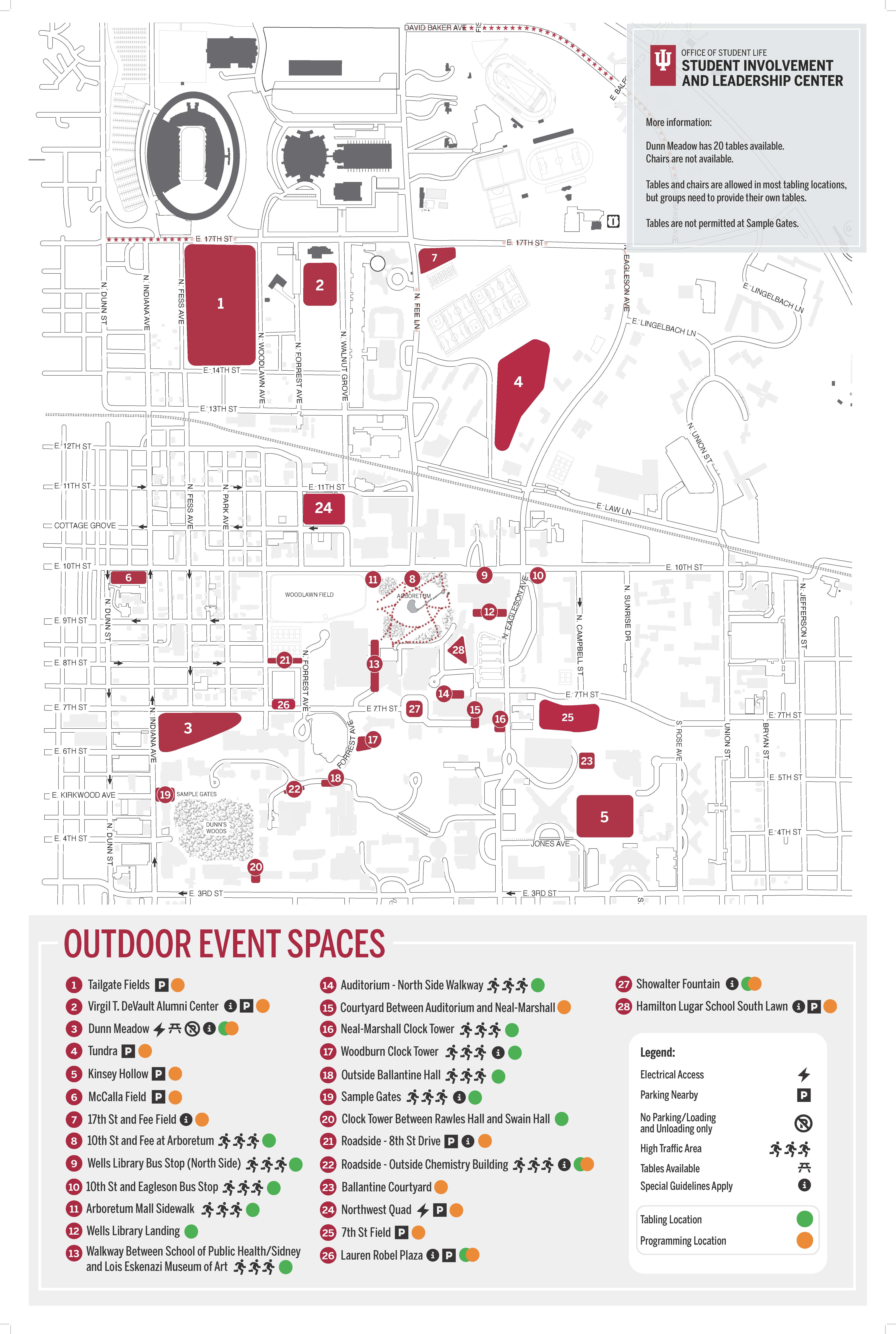 To download a map of reservable outdoor event spaces on campus, log into beINvolved and visit the Documents section of the Student Involvement and Leadership Center page or view the map below.
